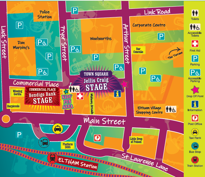 The Site: The Festival is situated across Eltham town centre and therefore the terrain is mostly flat and pavement. However, please note that the Town Square and Commercial Place maybe congested at times.